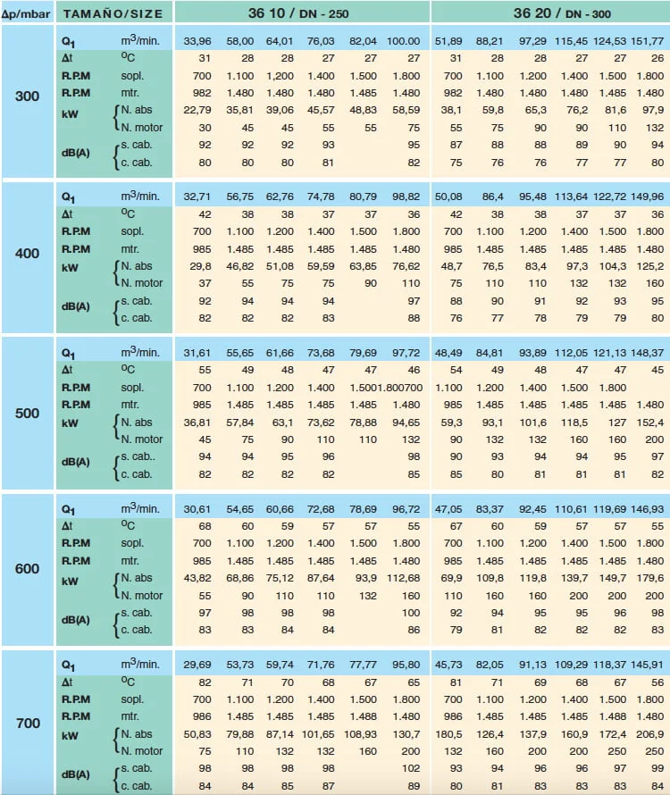PedroGil Roots Blower ailesinin bir diğer modeli olan 36 serisi blower grubu, 36-10, 36-20, 36-30 olmak üzere 3 ayrı ürün adlandırması ile yer almaktadır. DN250 – DN300 bağlantı çaplarına sahiptir. İlgili PedroGil Roots Blower ürünlerimizin kapasite ve boyut bilgilerine aşagıdaki tablodan kontrol edebilirsiniz. Blowerlar şase ve kabin akupleli olarakta istek dahilinde önerilmekte ve üretilmektedir.