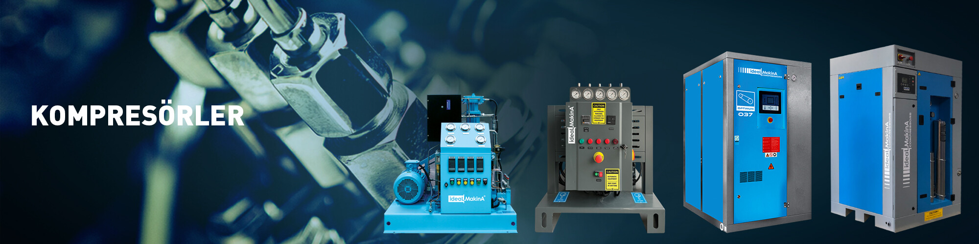 İdeal Makina ürün gamında başlıca yağsız (oil free) ve yağ enjeksiyonlu olmak üzere vidalı, pistonlu ve scroll hava ve gaz kompresörleri bulunmaktadır.
